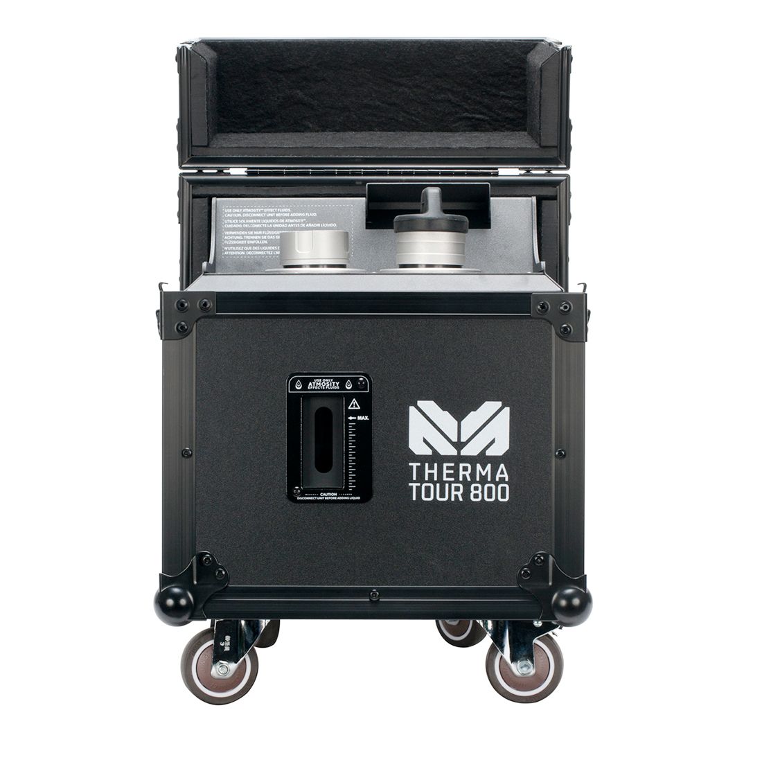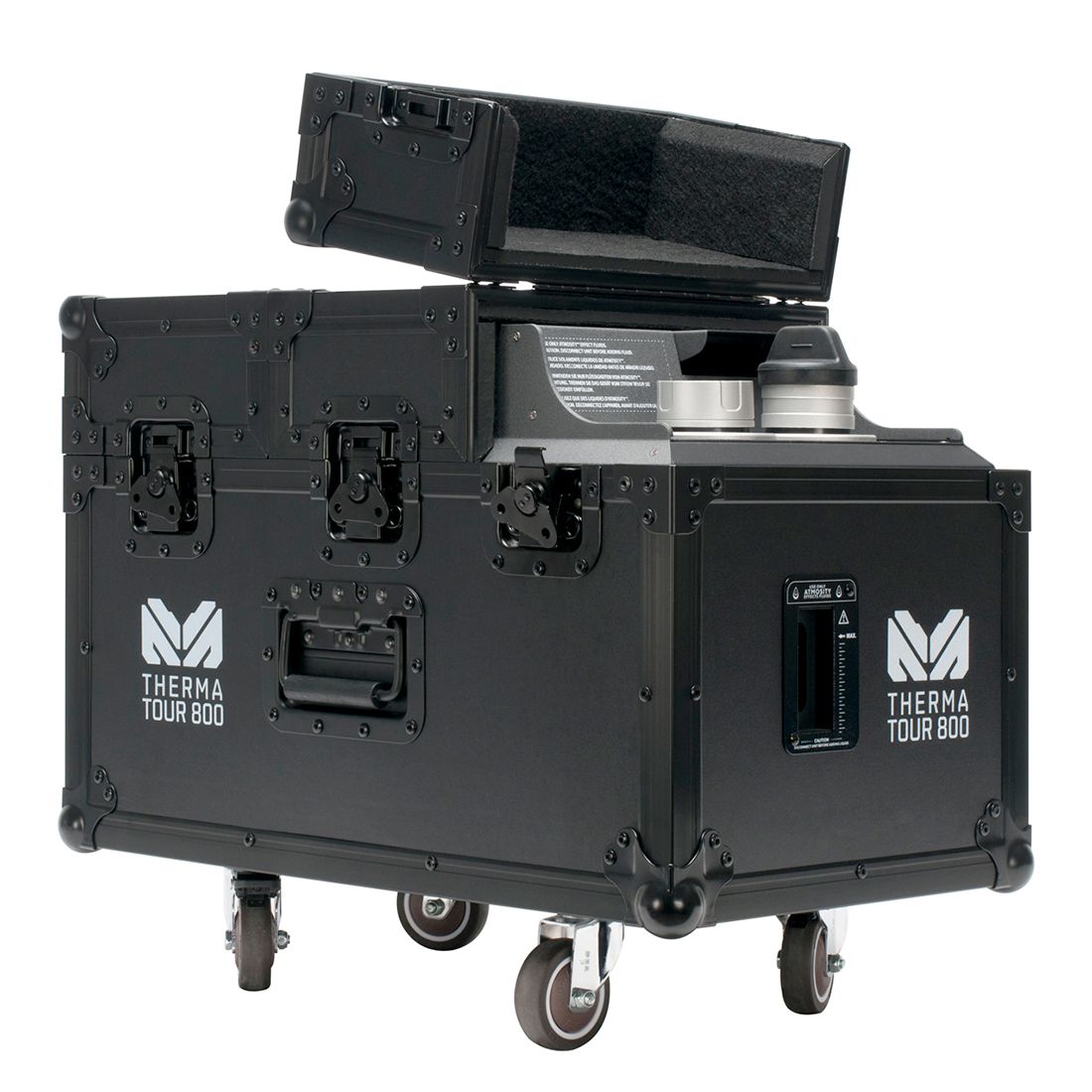 The Therma Tour 800 is a powerful oil-based haze effect generator that produces an exceptionally fine, long-lasting atmospheric haze that excels at revealing light beams and mid-air effects. The 800W Therma Tour 800 creates a safe, clean and odorless haze effect that leaves no residue. The perfect small-particle haze for highlighting light beams, the unit holds two liters of fluid for over 35-hours of run time with no warm up time required. Hang time is incredibly long at over 3 hours in an enclosed space! Compact yet ruggedly built to withstand the day in and day out rigors of on-the-road use, multiple control options include a wireless RF remote, Magmatic Magfly or Elation E-Fly wireless DMX, wired remote, Magmatic App, and manual, on-board, touch screen control.